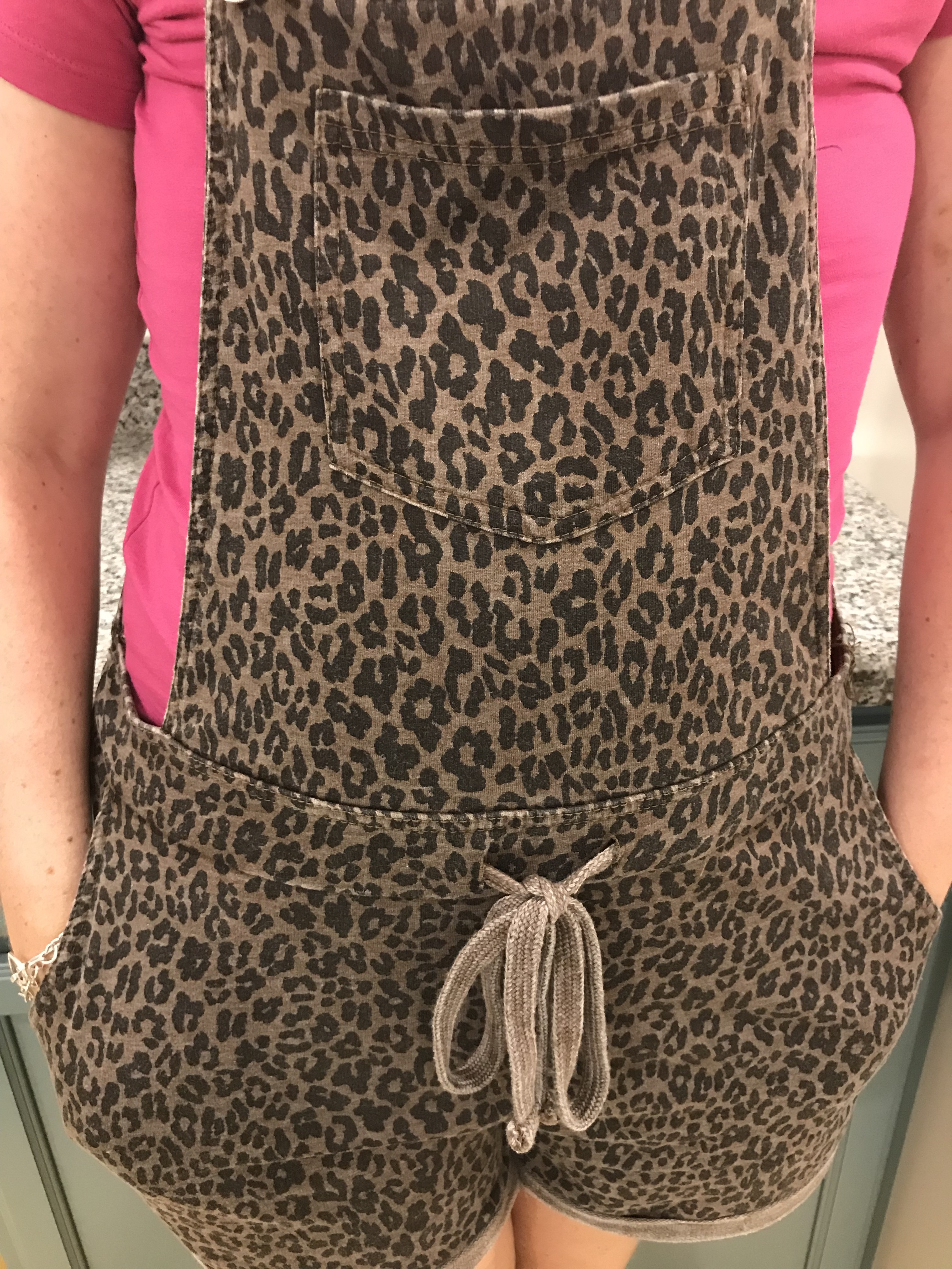 I bought a second pair of overalls this summer–a wonderful $12.99 find at TJ Maxx. I have worn these twice. They are so comfy, and they are fun. I mean it’s a leopard print jersey knit shorts overall. C’mon. You gotta admit that that’s fun. Here are the pics: