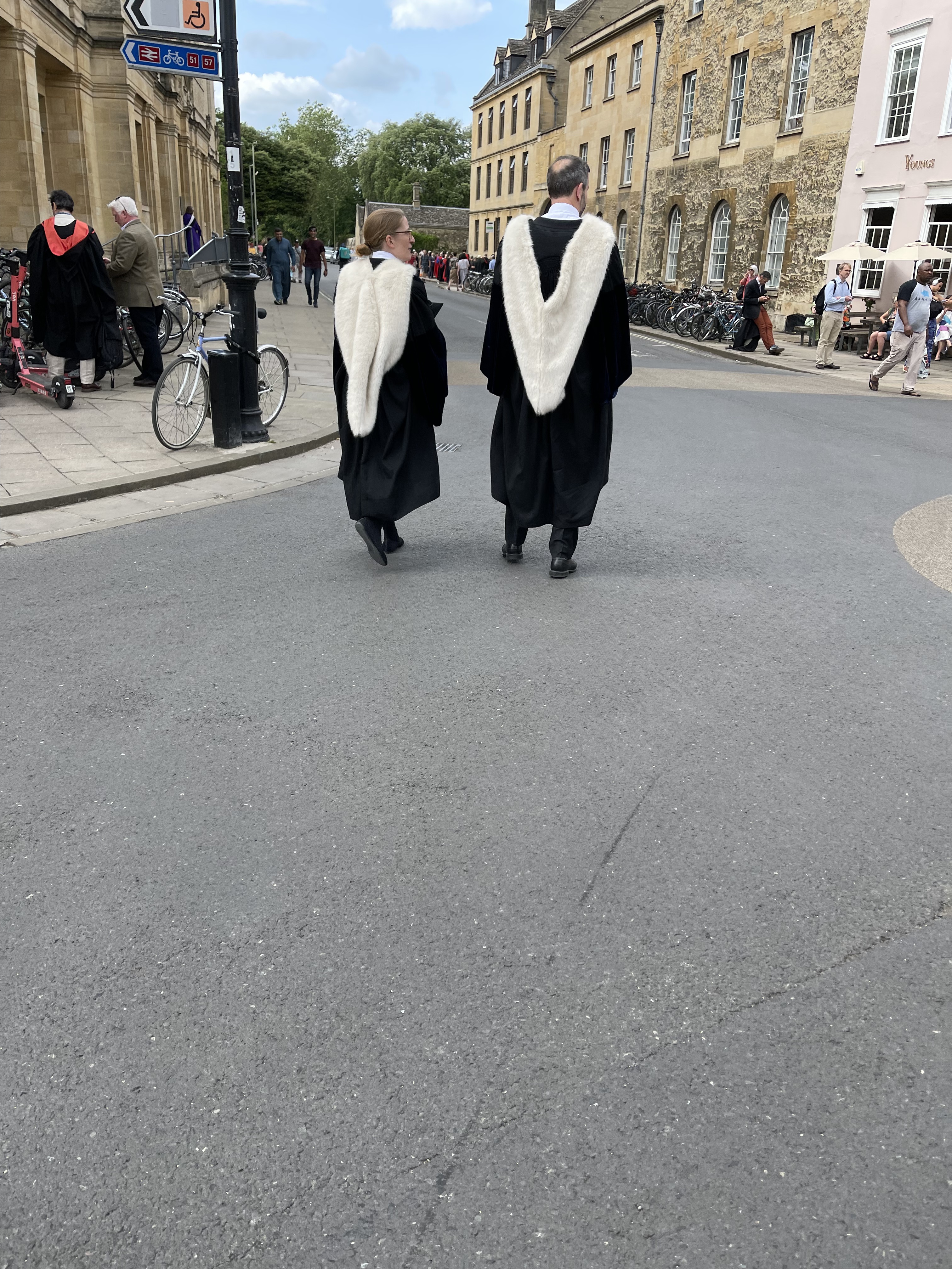 I also was around for Encaenia–a ceremony in which distinguished scholars, researchers, etc. are given honorary degrees from the University of Oxford. Note above some of the faculty wearing their robes. And notice that some of the people are wearing white fur hoods. I had no idea what that meant, but Alli Elliott and Christine Fulcher for sharing information with me about Oxford’s various hoods.