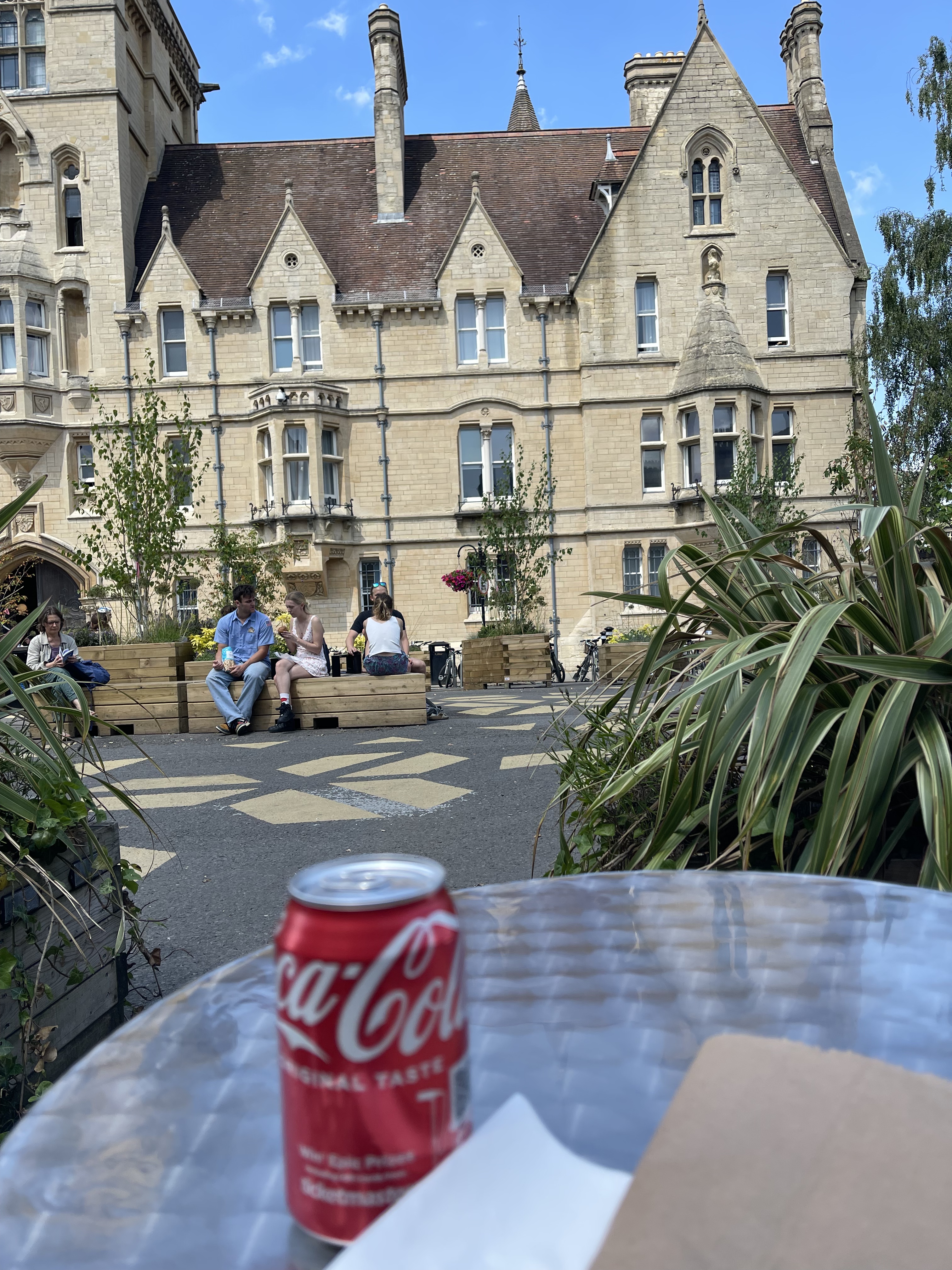 I split my writing time into chunks, and in the middle of the day I went for a walk outdoors around the libraries. Sometimes I’d grab an iced coffee and a muffin and sit in the tourist zone. Sometimes I’d get a calzone and a coke and sit in the terrace seating behind a tiny restaurant with no indoor seating. It’s a takeaway place.
