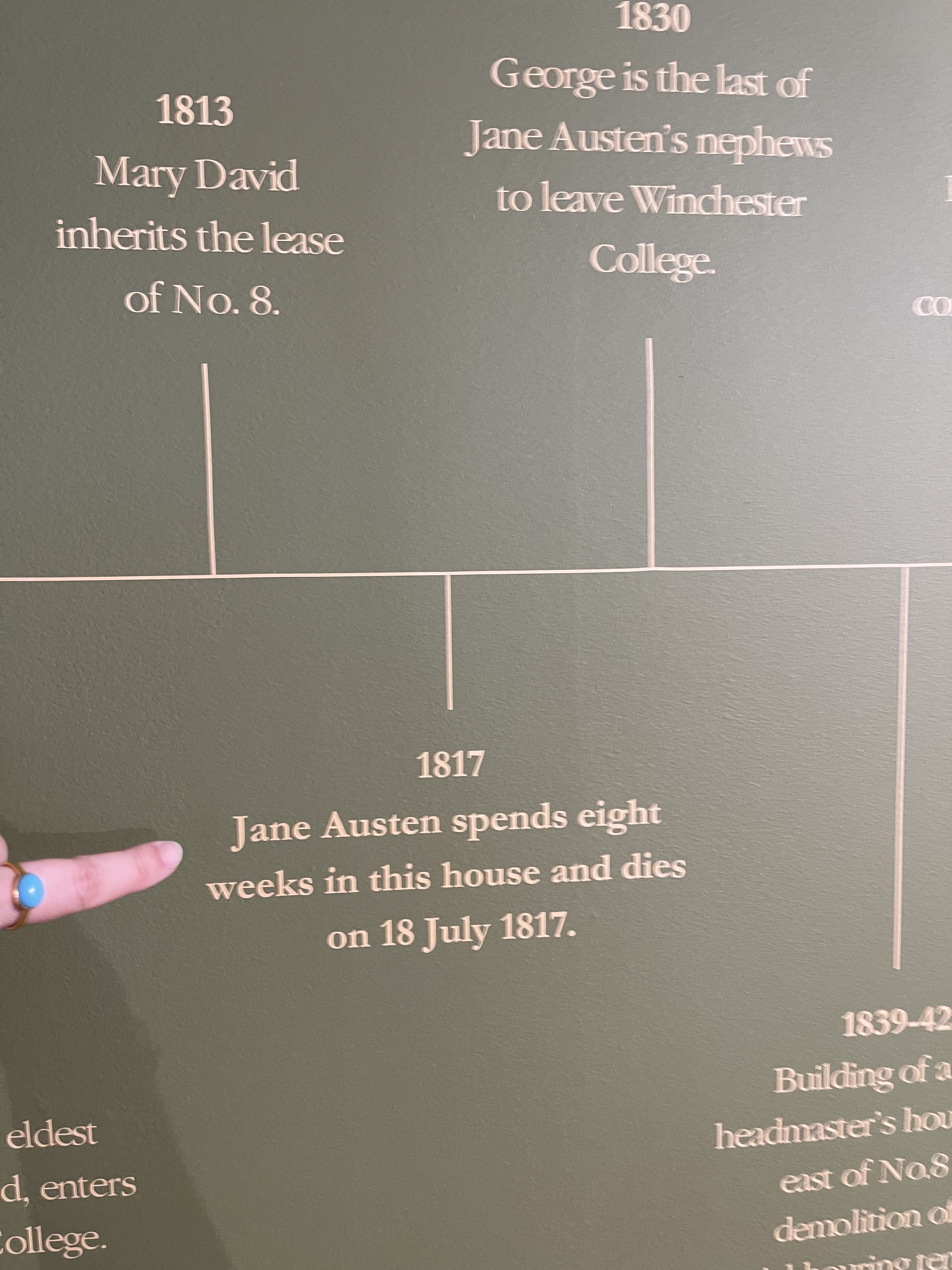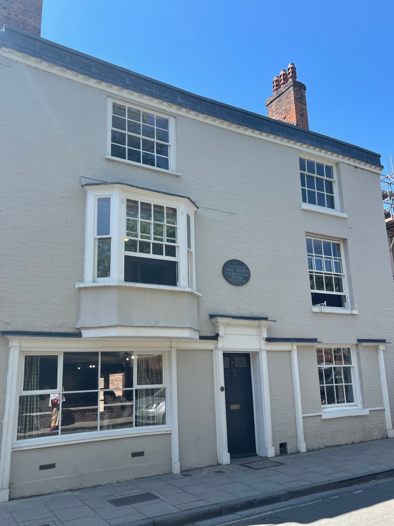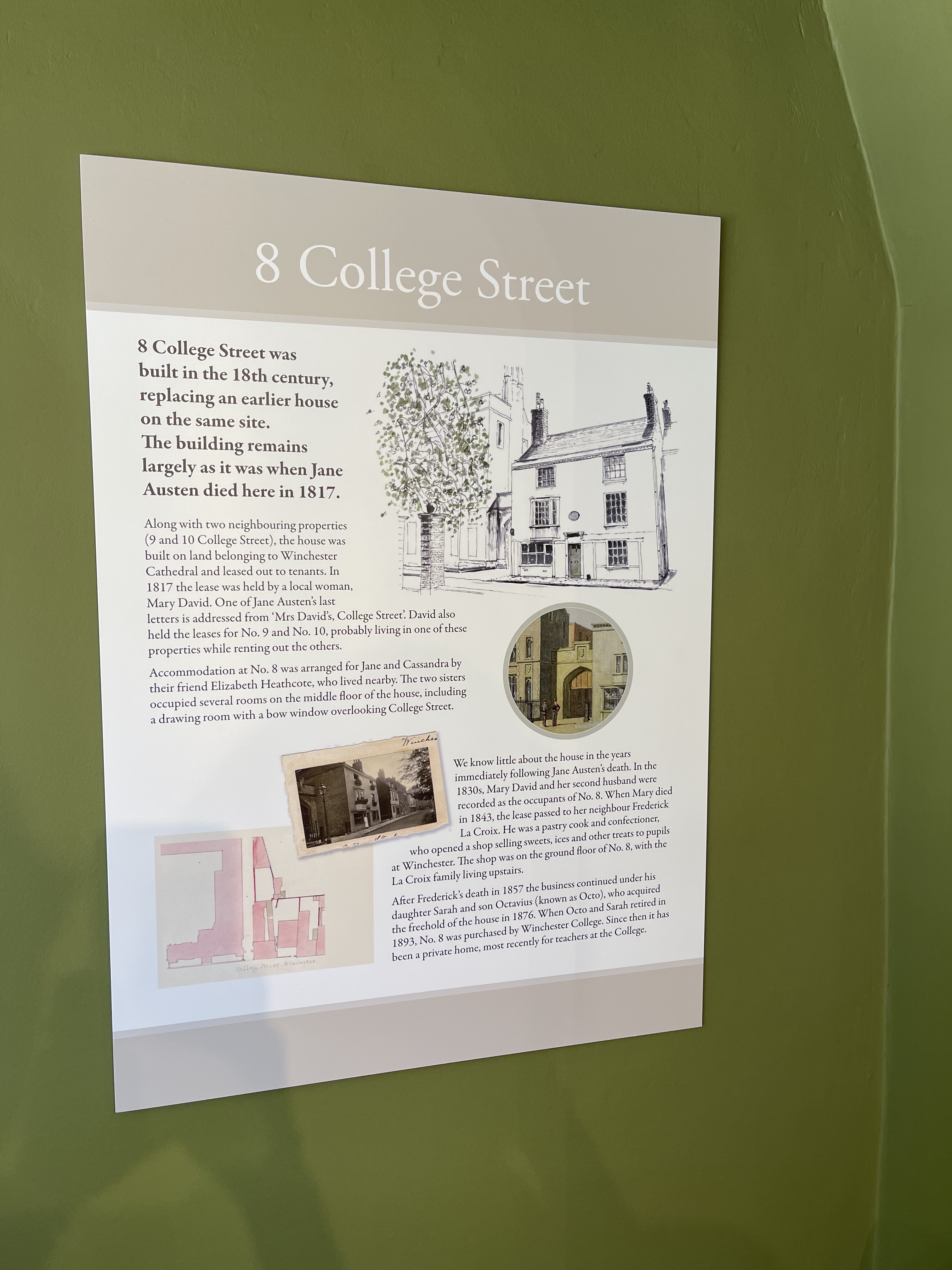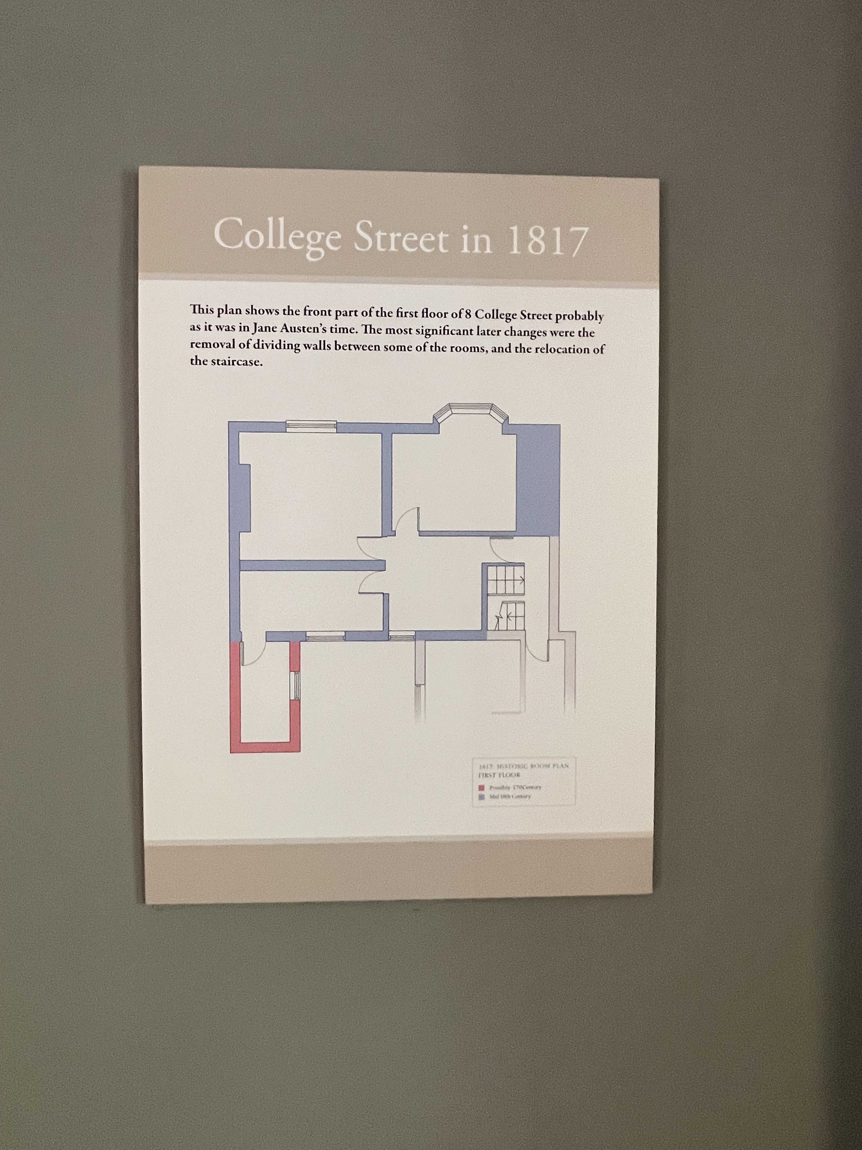 Until 2025, 8 College Street remained in private hands and was not open to the public. Thankfully Winchester College recently decided to open the flat to tours for this summer (and just this summer, apparently). Before this July, I had visited Winchester two other times (2017, 2023) and walked by that apartment. I even sat outside across the street for a while in 2017 like some creeper and just stared at the building, imagining where the Austens lived in the building exactly. Turns out I was wrong. I thought they lived on the ground floor, but I learned on July 13 that they lived on the first floor–what Americans might call the second floor–of the building.