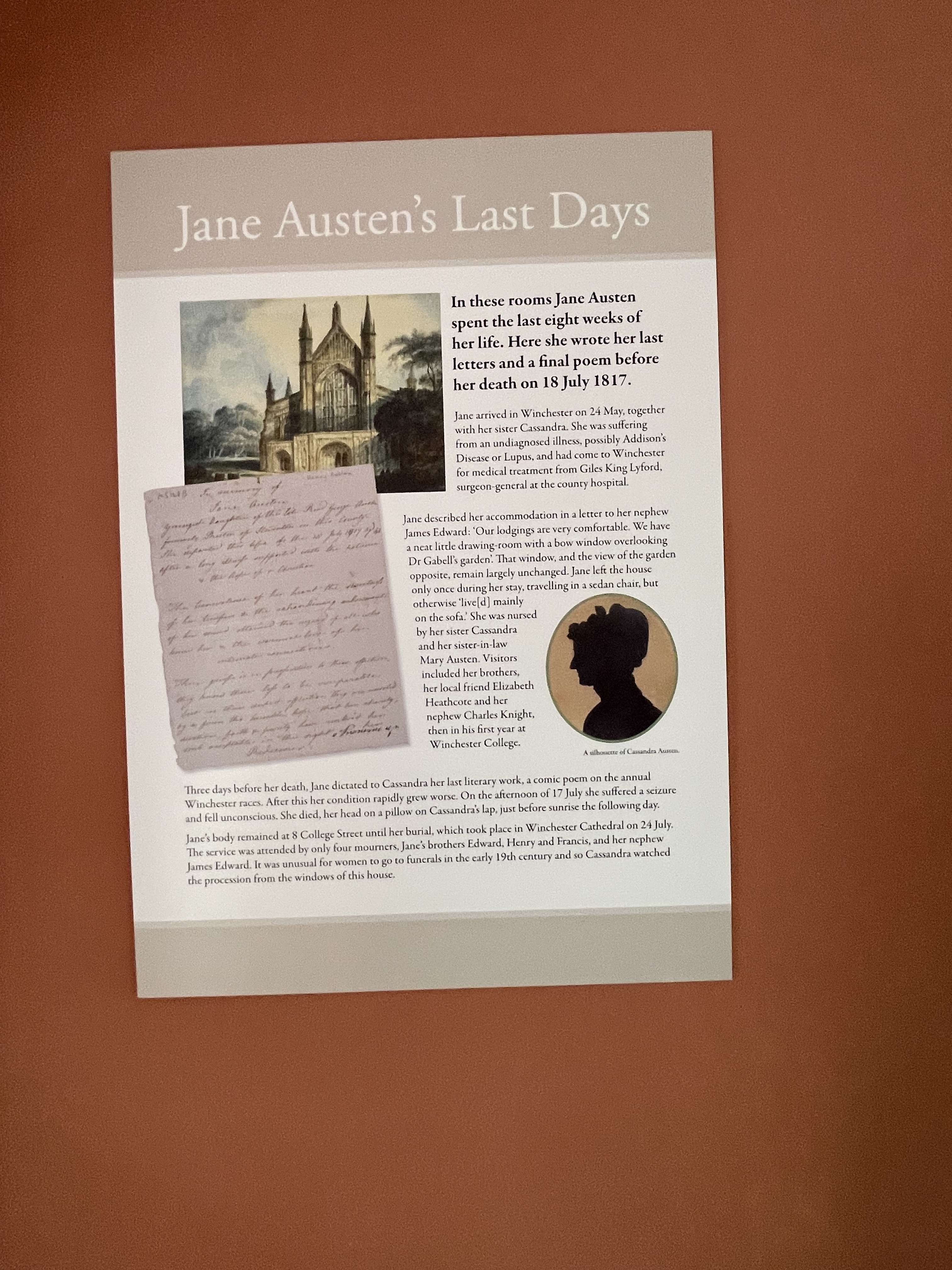It’s the flat where Jane Austen lived during the last months of her life while she was undergoing treatment for a mysterious illness (possibly Addison’s Disease, Hodgkin’s Lymphoma, or Lupus) that would eventually kill her. It’s like a scene out of a sad movie. Jane and her sister Cassandra moved from Chawton to Winchester in late May 1817 to seek medical care, and on July 18 Jane passed away in the arms of her sister. So it’s also the place where Jane Austen died. It’s ironic, or maybe not, that on the 250th anniversary of Jane Austen’s birth, and a mere week before her death date, I visited 8 College St.