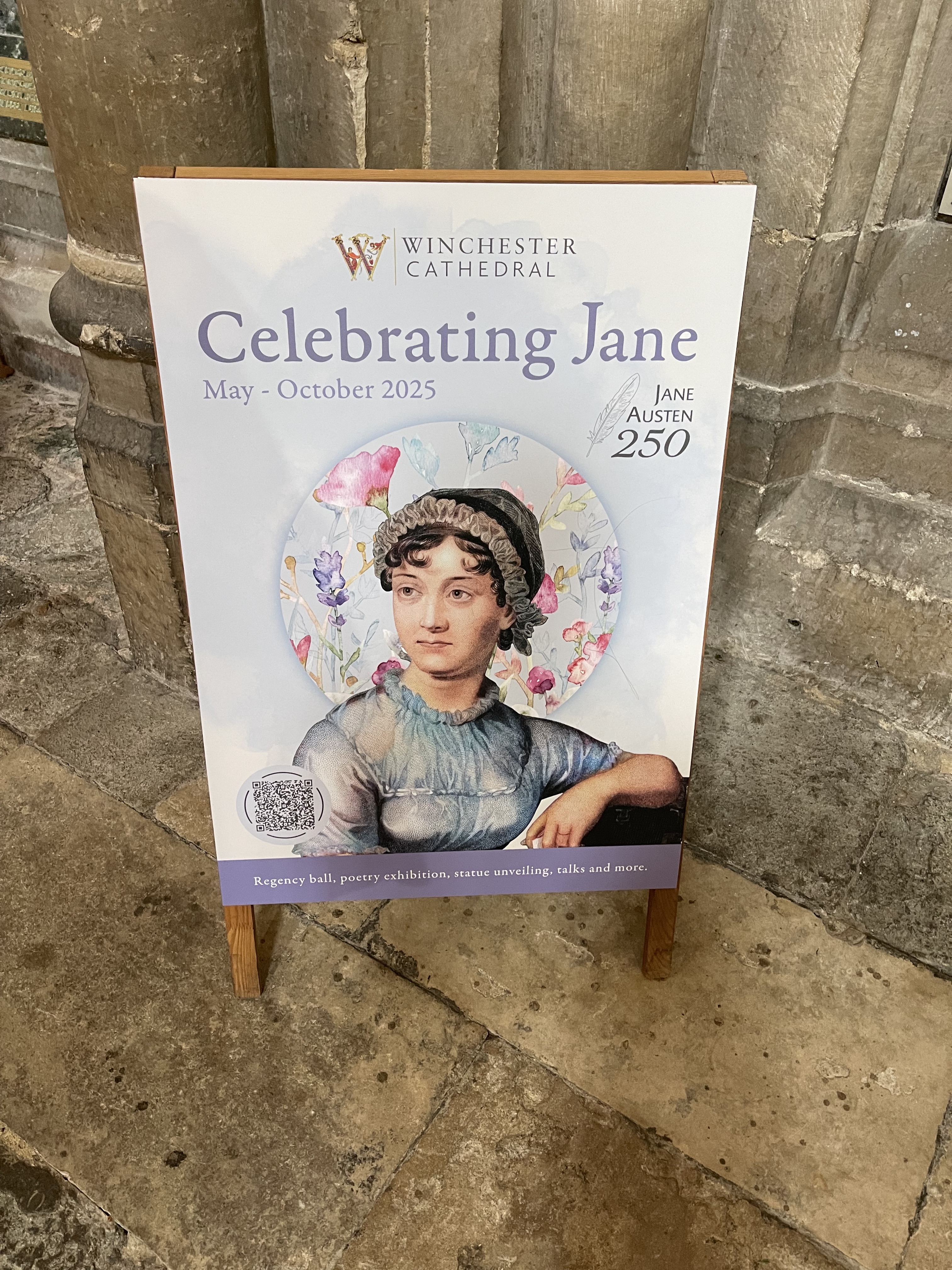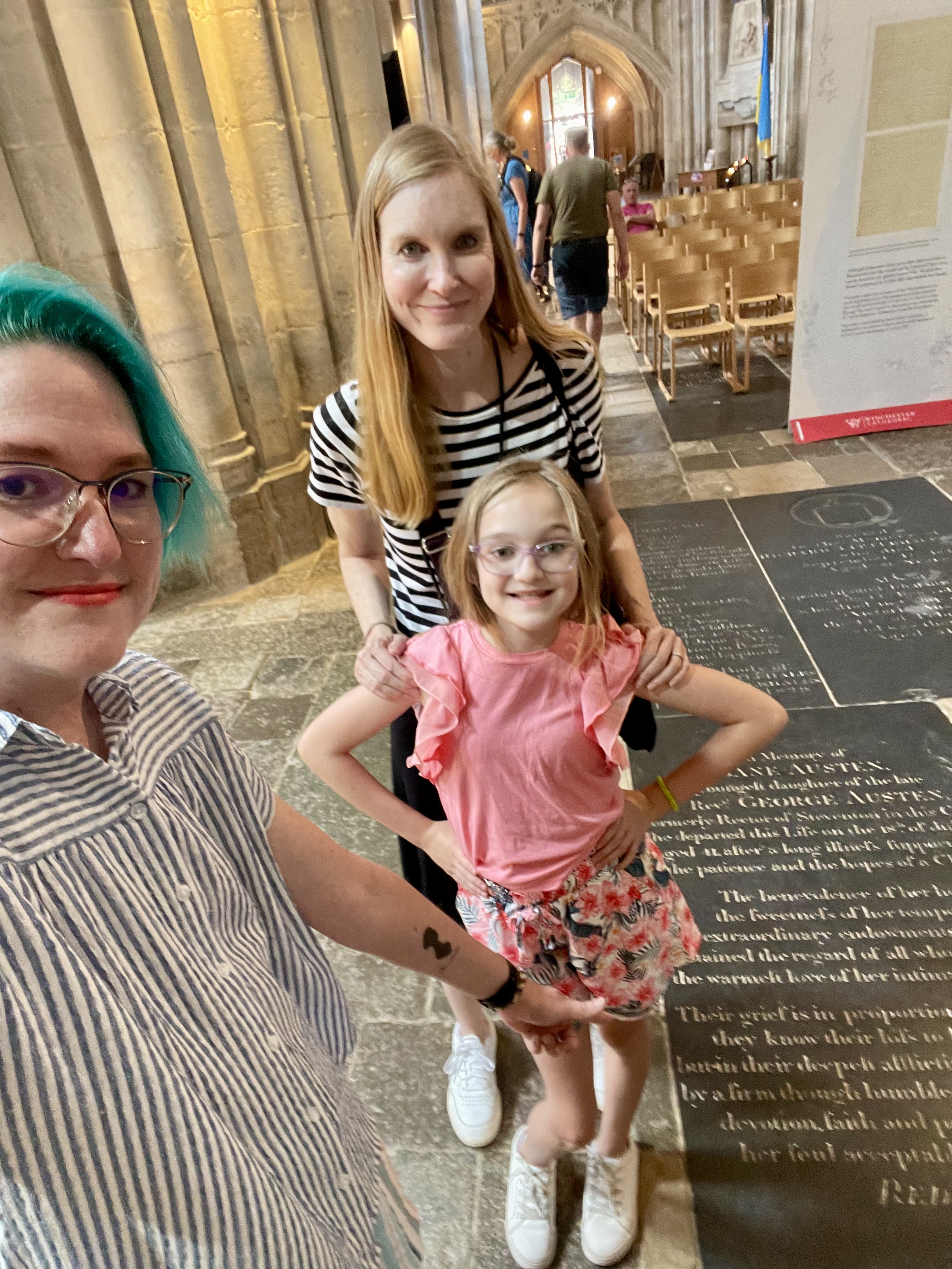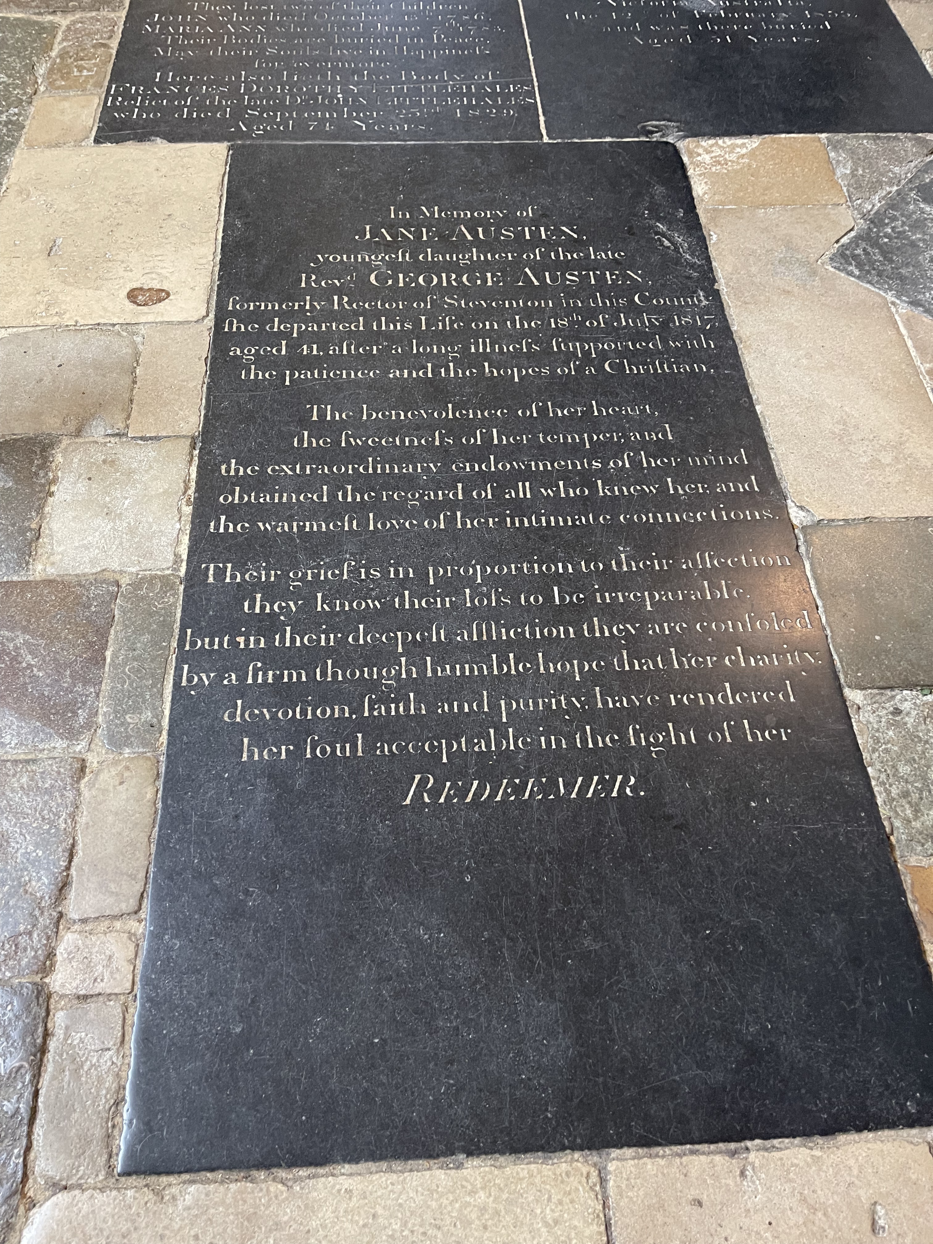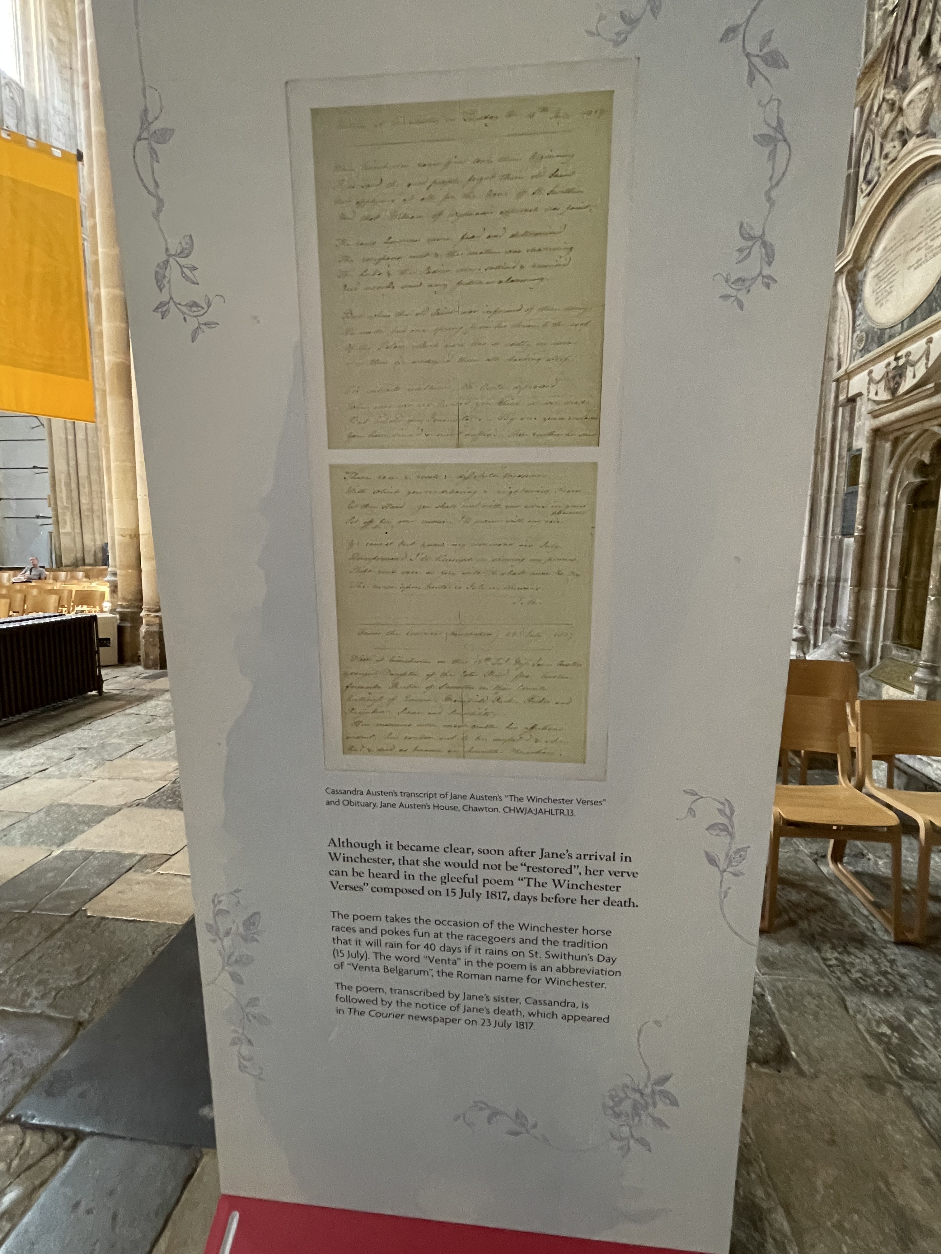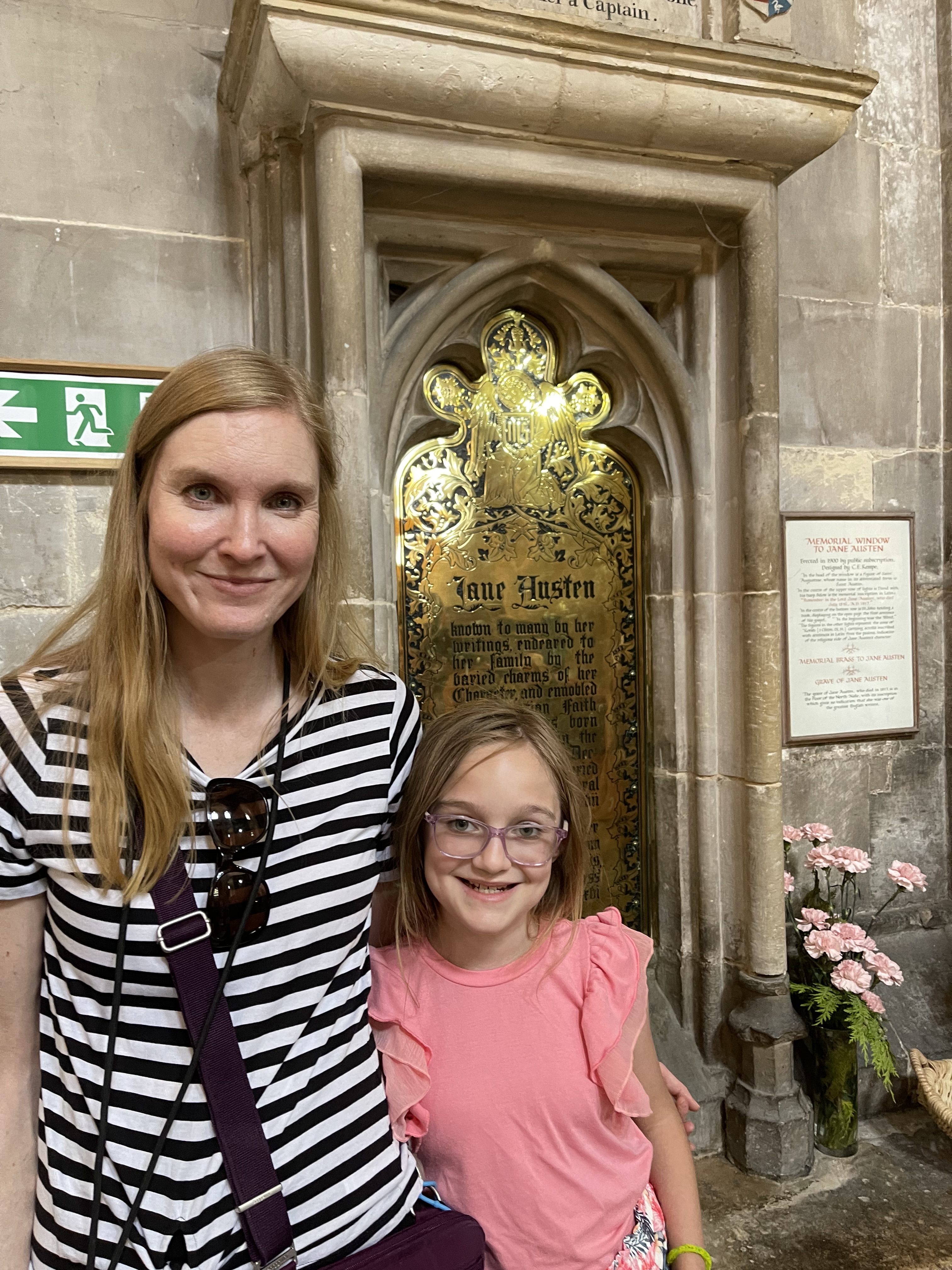 After I left the gift shop, I met up with my family at Winchester Cathedral, where Jane Austen is buried. I have been there before, but it was cool to take Lacy and Kensington to the place where Jane is buried. I won’t get into the history of how Austen came to be buried in the cathedral. If you’re interested, check it out here. I’ll say this: it is an honor to visit in this gorgeous cathedral an author many fans worship. I was also excited to see a small exhibit there about Jane’s dear friend Anne Lefroy.